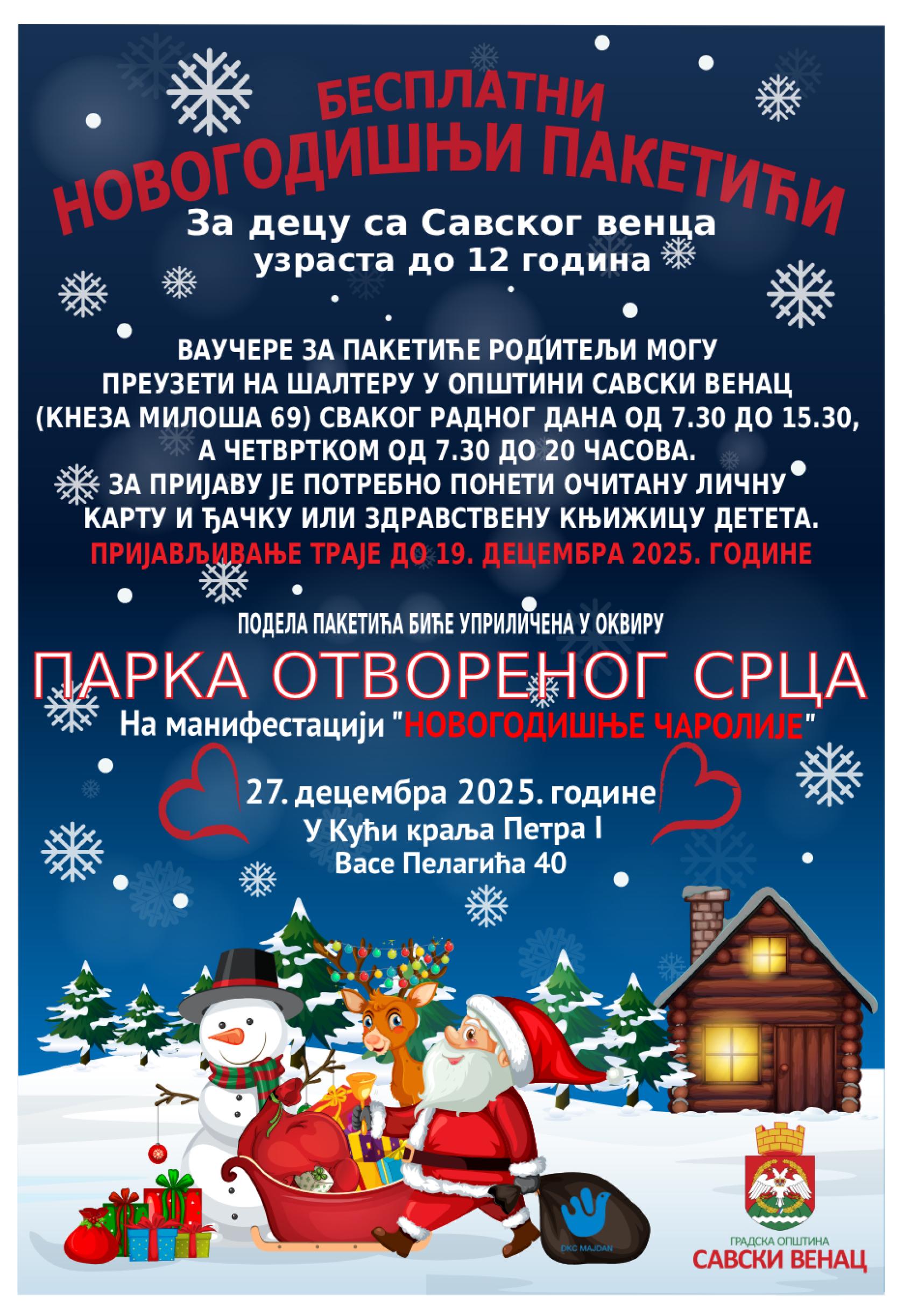 Подела пакетића биће приређена у оквиру Парка отвореног срца на традиционалној новогодишњој манифестацији „Новогодишње чаролије“ 27. децембра 2025. године у Кући краља Петра Првог (Улица Васе Пелагића 40), од 11 до 14 часова.
